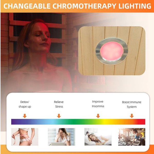 【Izboljšana sprostitev】 Naše infrardeče savne za dom ima streho, osvetljeno s 7 barvno svetlobno terapijo, kar ustvarja potopno vzdušje za izboljšanje vaše splošne izkušnje. V vaši kleti, kopalnici ali telovadnici je enostavno namestiti, s povezavo Bluetooth in kisikovim palico